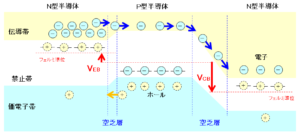 P型半導体とN型半導体を接合すると、P型半導体の電位に比べ、N型半導体の電位は下にずれるような形になります。そして下図のように、P型半導体とN型半導体のフェルミ準位が一致するところで平衡状態となります。