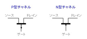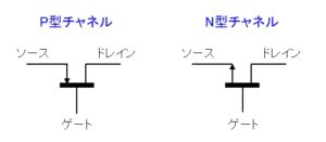 MOS型FETのP型チャネルとN型チャネルの回路記号は以下になります。