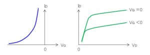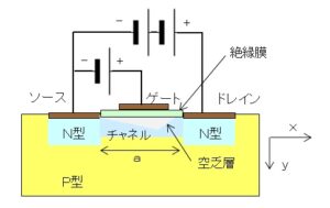 空乏層はゲート電圧 $V_G$ とドレイン電圧 $V_D$ により幅が変わるため、ドレイン電流 $I_D$ を制御することができます。このときゲート電流はほとんど流れないため、バイポーラのトランジスタより、真空管に似た特性を持ちます。