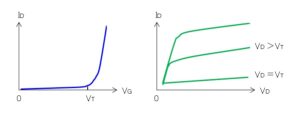 ゲート電圧を掛けたときにドレイン電流が流れるものをエンハンスメント(ノーマリOFF)、ゲート電圧を掛けないときもドレイン電流が流れるものをデュプレッション(ノーマリON)に分かれます。MOS型のほとんどがエンハンスメント、接合型のほとんどがデュプレッションです。